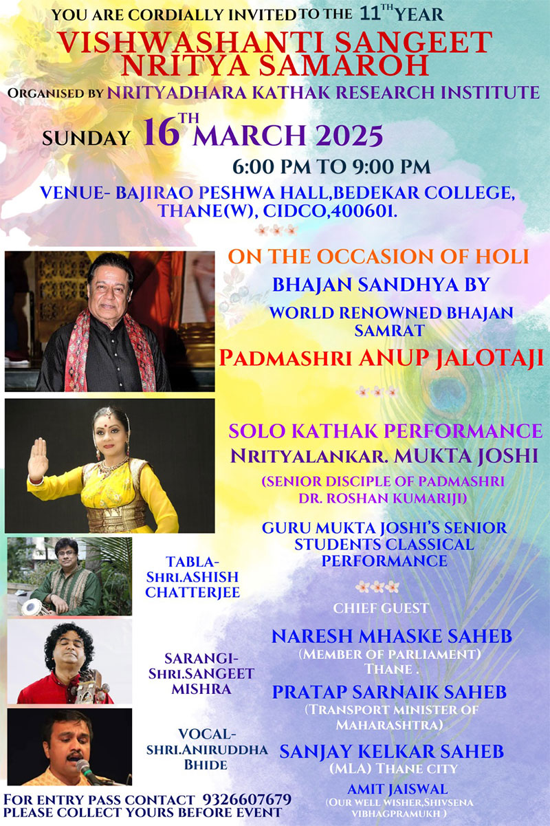 Mukta Joshi a famouse kathak dance guru, coreographer and A grade artist of Doordarshan Mumbai, India living in Thane. MUkta Joshi is Member of International Dance Council CID under registration number 22861 for the year 2018Over last twenty years Mukta has been taking systematic training from her Guru Padmashree Roshanji. She is propagating Jaipur dance style in Thane and Kalyan. With this aim Mukta has founded Nrityadhara Kathak Research Institute Mukta has performed on the prestigious dance stages at Jaipur, Jodhpur, Allahabad, Lucknow, Delhi and Mumbai etc. Mukta has also presented dances based on novel concepts but she is always careful about not to cross the boundaries of tradition. Her experiments in Tribhangima, in which she presented artistic combination of three dance styles, and Jugalbandi of kathak and lawani won accolades. She has also worked as assistant choreographer for renowned director Shyam Bengal's film Saradari Begum.